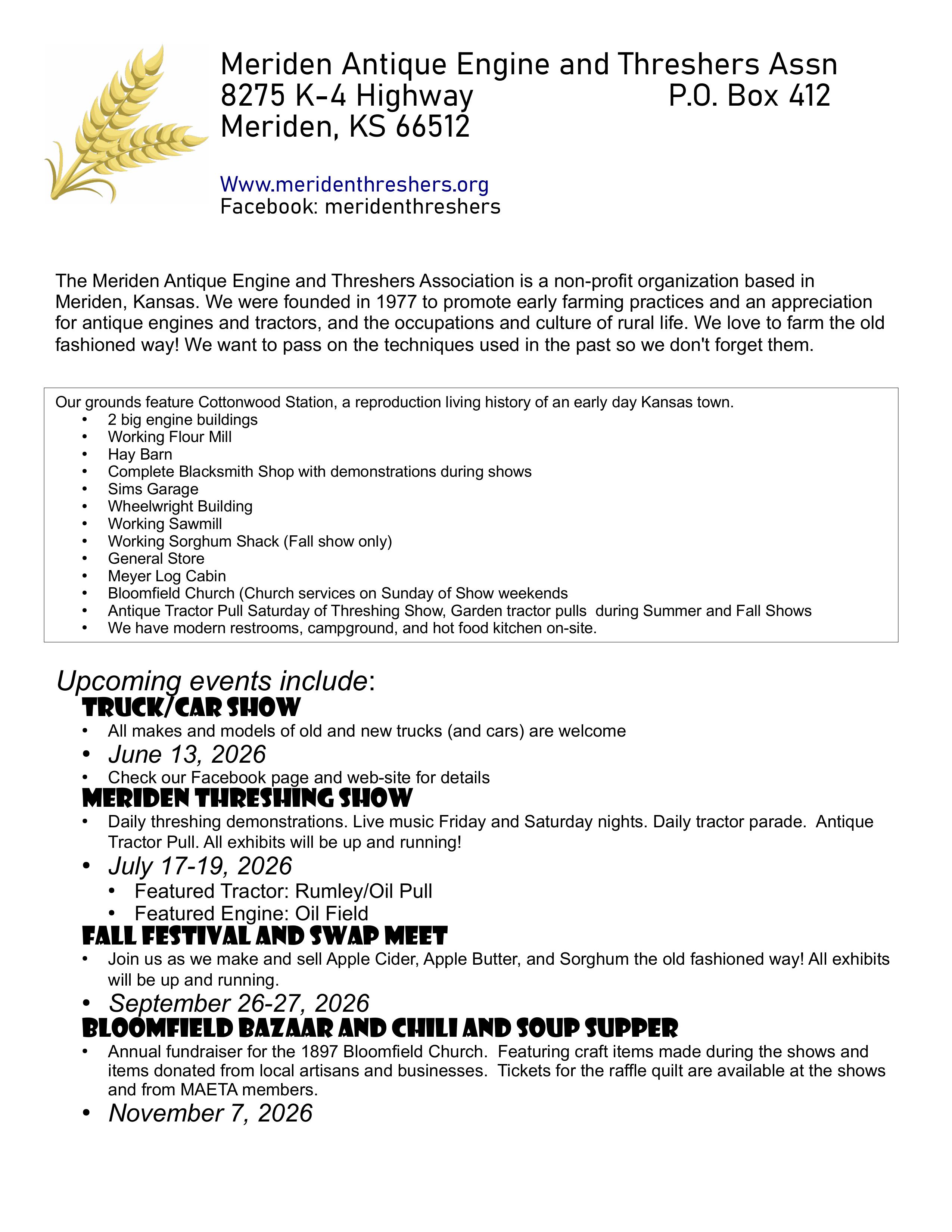 If you are interested in membership, fill out our Membership Application and mail to: Meriden Threshers Association, PO Box 412, Meriden, KS 66512.
